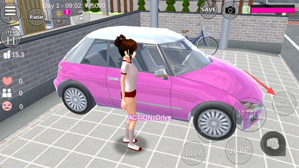 游戏玩法很自由,在游戏中你可以做任何事情,比如我们前往小汽车旁,点击ACTION;
