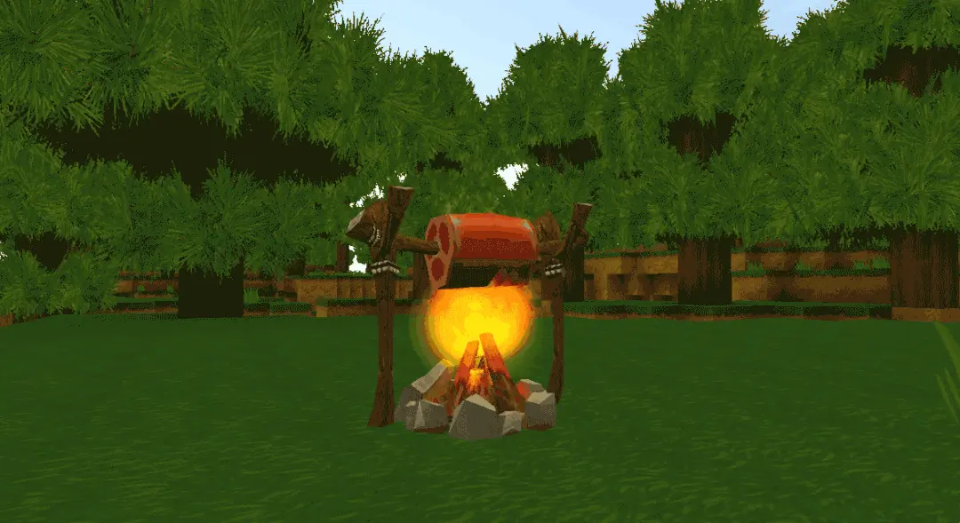 先摆放篝火,手持火把点击篝火之后,把普通肉类(生鸡腿、生猪肉、生牛排、生羊腿)摆在点燃的篝火上: