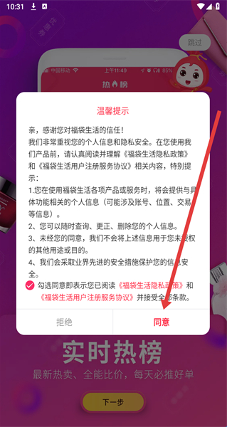 1、点击“温馨提示”弹窗的“同意”,进入福袋生活APP主界面。