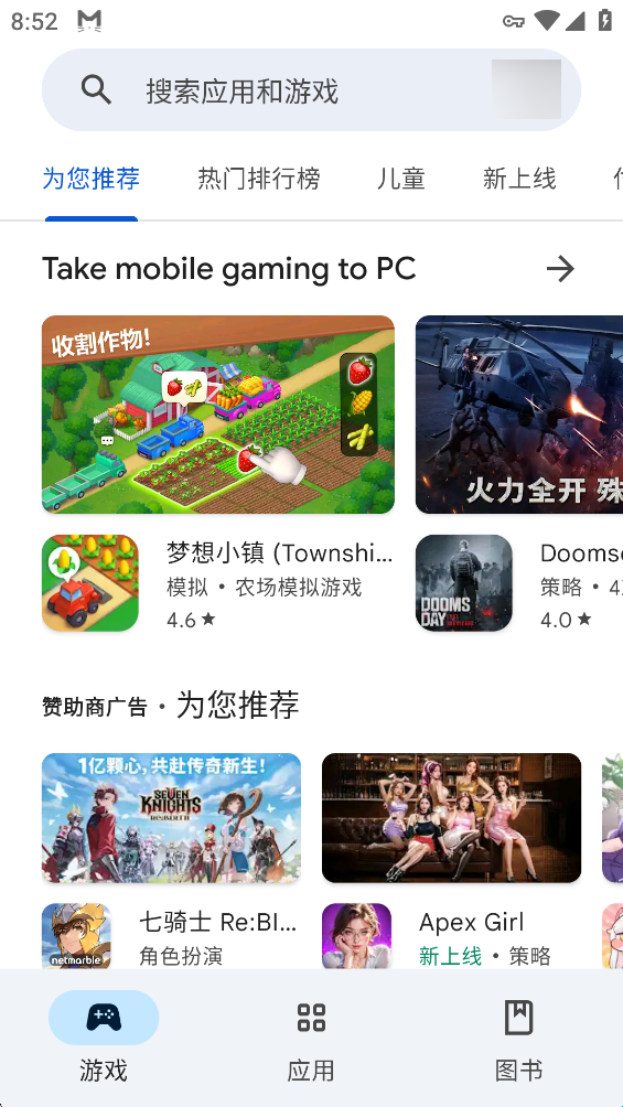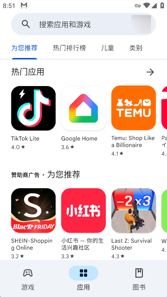 5、点击上方的搜索框,可以输入关键词搜索应用以及游戏。