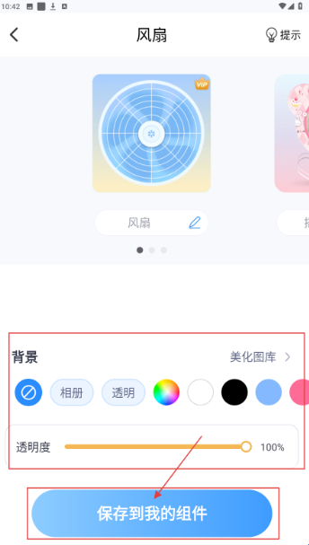 2、进入小组件详情页面,可以进行设置小组件颜色、透明度等,设置完成后点击【保存到我的组件】。