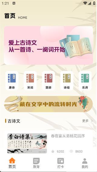 2、在首页即可看到唐诗、宋词、楚辞等分类,可以根据自身需求进行选择。