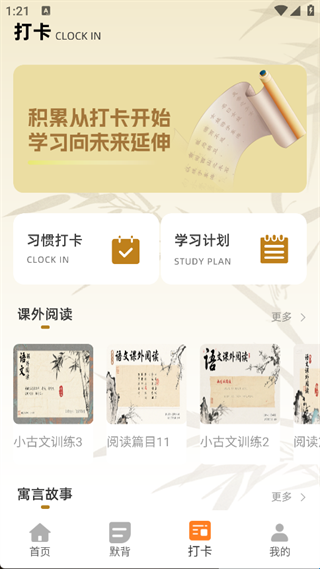 4、点击页面下方的‘打卡’,即可开始看到习惯打卡、学习计划、课外阅读等功能。