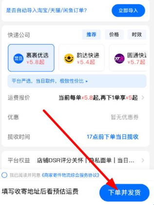 3、填写收件人地址、选择快递公司,还可查看运费报价等信息,确认无误后勾选协议,点击下单并发货,等待快递员上门取件。