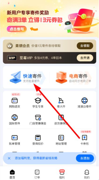 1、需要打开掌中通应用进入首页,点击快速寄件选项,进入寄件操作界面。