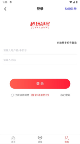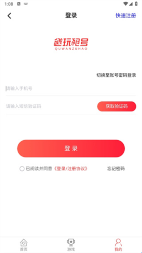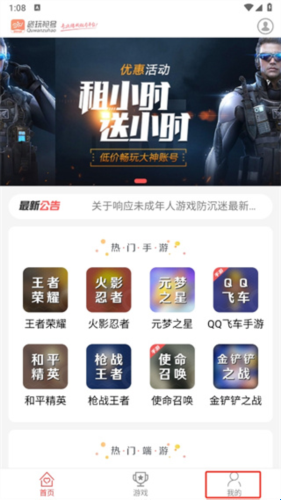 1、首先打开趣玩租号极速版软件,进入到首页切点击【我的】。