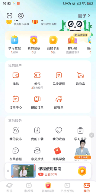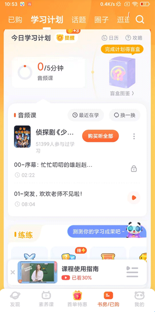5、购买的课程可以在书房/已购页中查看,也可以在此页制定学习计划,参加话题讨论,逛圈子等。