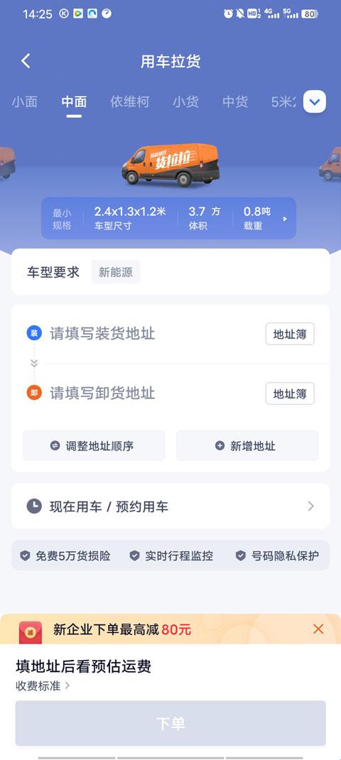 2、选择自己想要的车型,输入收卸货地址,然后预约用车时间,点击下单即可。