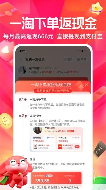 5、一淘钱包:返利金额会发放到我的页面的一淘钱包,点击一淘钱包提现到支付宝即可。