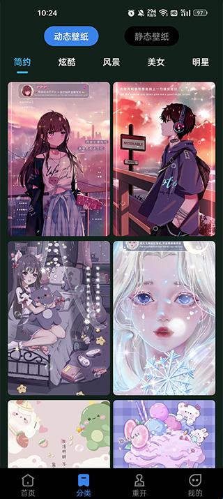 2、精选分类,一键设置:多样化的壁纸分类,包括影视、明星、动漫、游戏等,轻松找到你的最爱,一键设为桌面或锁屏。